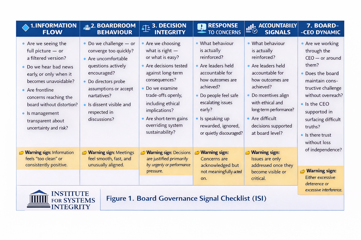 A governance diagnostic framework outlining seven lenses boards should continuously test to detect early signal failure, strengthen oversight, and prevent integrity drift before risks become visible.