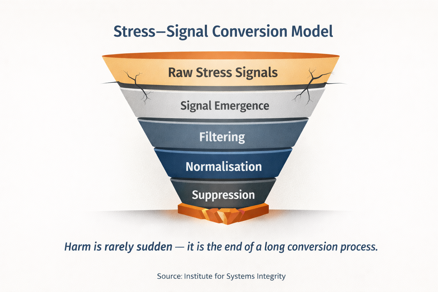 The Stress–Signal Conversion Model describes the systematic process by which early stress signals are filtered, normalised, and suppressed, transforming warning signs into organisational silence before harm occurs.